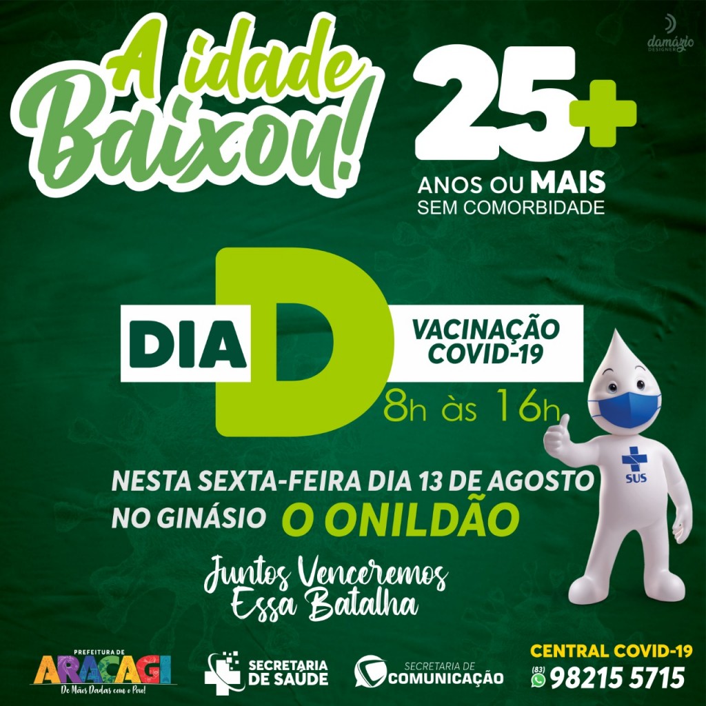 A secretaria Municipal de Saúde informa a os araçagienses que nesta sexta feira dia 13 de agosto, estará acontecendo o Dia D de vacinação contra a covid 19, o local será no ginásio o Onildão no Conjunto José Pessoa, das 8h às 16h.